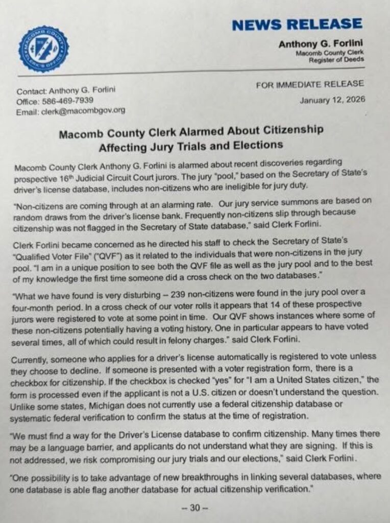 This week, Macomb County Clerk Anthony Forlini gave a clue as to the extent of non-citizen voting. Forlini is running for Secretary of State as a Republican.