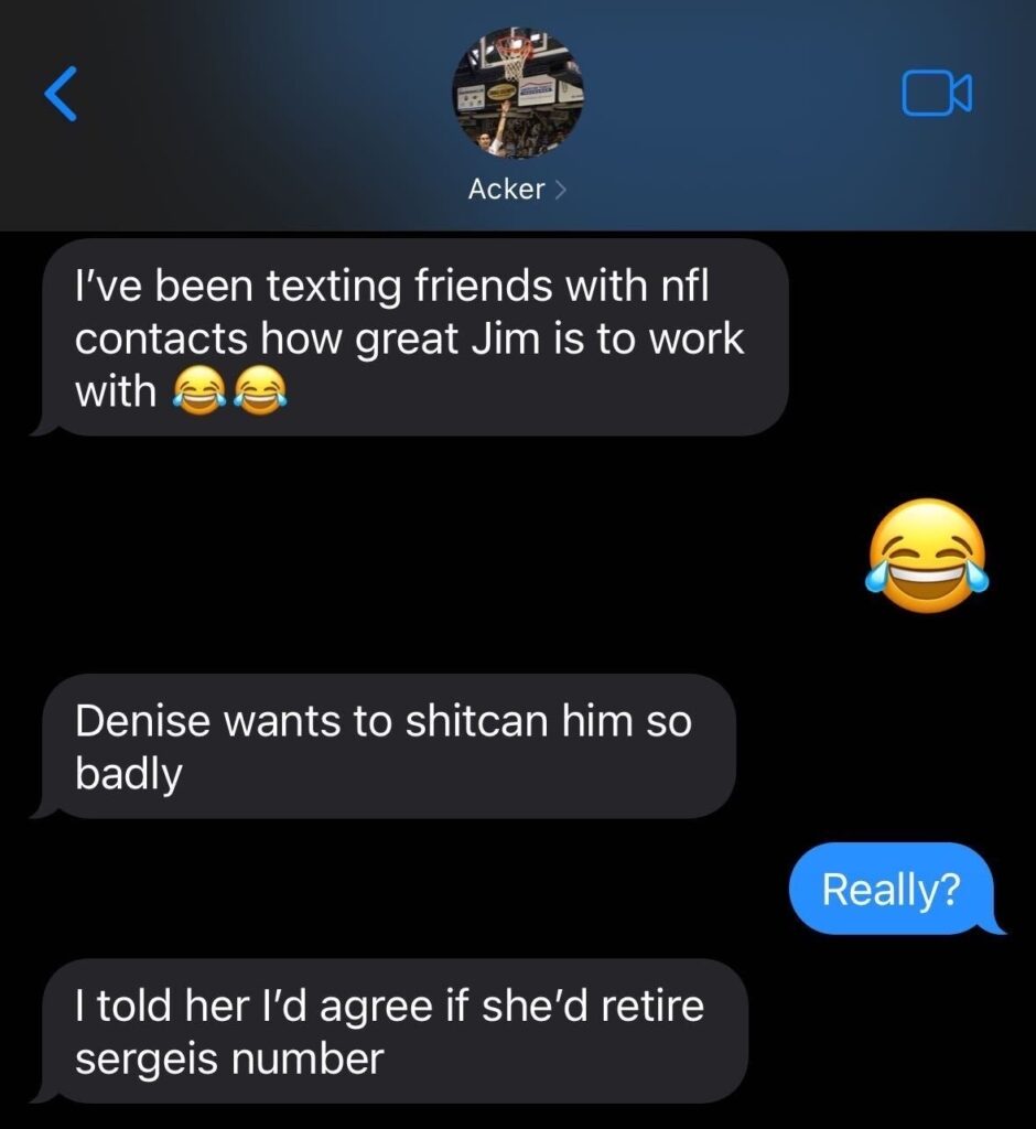 Later, Acker told Moss that he’s “been texting friends with NFL contacts how great Jim is to work with,” followed by two crying-laughing emojis.