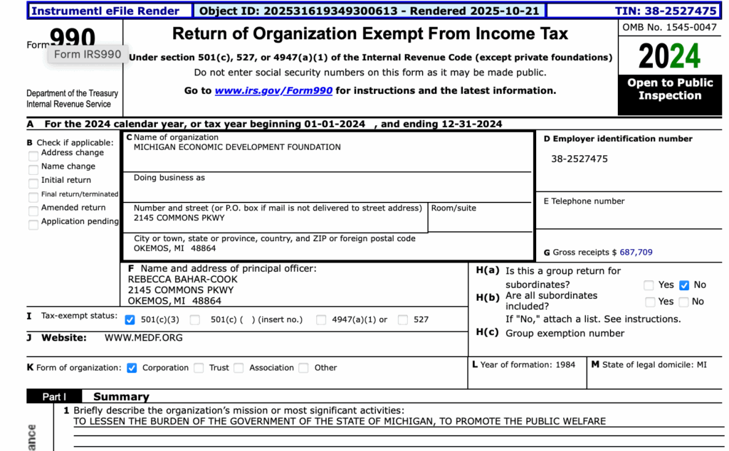A separate Freedom of Information Act Request showed that the MEDC transferred $881,604.51 to the MEDF in 2024 and last week, MEDF quietly filed their annual IRS 990 form.